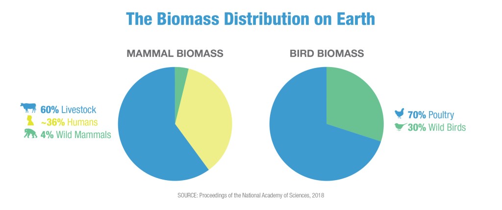 Today, livestock is 60% of all mammal biomass on the planet (with wild mammals accounting for only 4% and most of the remainder attributed to humans), while poultry accounts for 70% of bird biomass, denoting a major man-made change in the species makeup of our planet. Genetically modified to grow massively large while still babies, animals are confined by the thousands in cramped cages and sordid sheds, fed GMO corn and soy, and injected with medically-important antibiotics to keep them alive just long enough to kill them. Suffering from respiratory disease and impaired immune systems, they are the perfect incubators for pathogens to mutate and spill over to humans. In factory farms and in wet markets, we are creating monster zoonotic viruses that threaten our very survival.