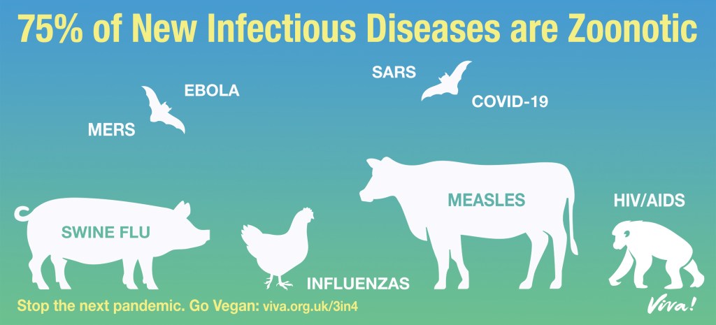 In researching this topic, I read the report “Zoonoses – A Ticking Time Bomb” by Dr. Justine Butler, Senior Health Researcher and Writer at Viva!, a UK Vegan Charity. I learned that Zoonotic diseases are diseases that spread from animals to humans. They include familiar ones, such as the common cold, influenza (flu), polio, AIDS, measles, and other lesser-known ones, such as SARS, MERS, Nipah virus and Ebola. Most recently, COVID-19 has joined this growing list, having jumped from bats or other wild animals, to humans, leading to the current pandemic.