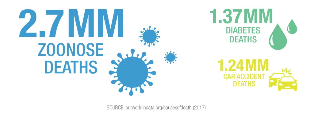 I also learned that there are over 200 zoonotic diseases, and 56 of them affect 2.5 billion people and cause nearly three million deaths each year. For frame of reference: in 2017, zoonotic diseases caused 2.7 million deaths, diabetes caused 1.37 million deaths and traffic accidents caused 1.24 million deaths globally. Non-pandemic zoonoses caused more worldwide fatalities than all traffic accidents and diabetes combined.